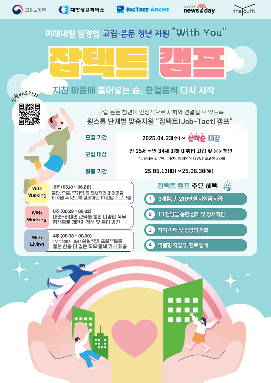 잡택트 캠프에서 심리 회복부터 직무 탐색, 실전 프로젝트까지 당신의 재시작을 위한 16주 여정이 기다리고 있어요. 나만의 변화, 첫걸음을 함께 내딛어보세요.