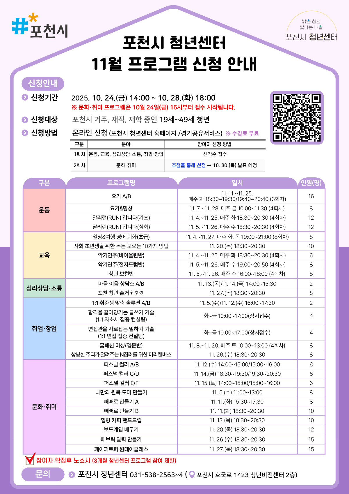 「포천시 청년센터 11월 프로그램」과 관련하여 아래와 같이 안내드립니다.