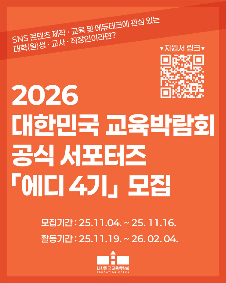 23년의 역사와 전통을 자랑하는 국내 최초·아시아 최대 규모의 교육·에듀테크 전문 박람회, 대한민국 교육박람회와 함께할 홍보 서포터즈 ‘에디’ 4기 요원을 찾습니다! 활기찬 박람회를 함께 만들어가며 콘텐츠 제작 및 현장 운영 경험을 쌓아보세요!