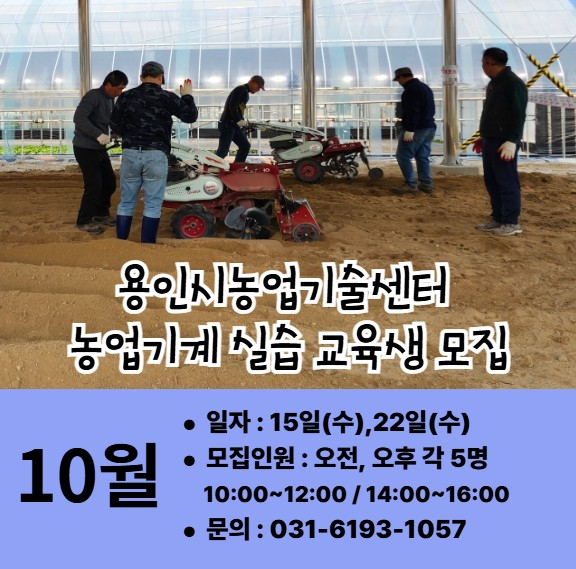 용인시농업기술센터에서 아래와 같이 농업기계 실습 교육생을 모집합니다. 관심있는 분들의 신청을 바랍니다.