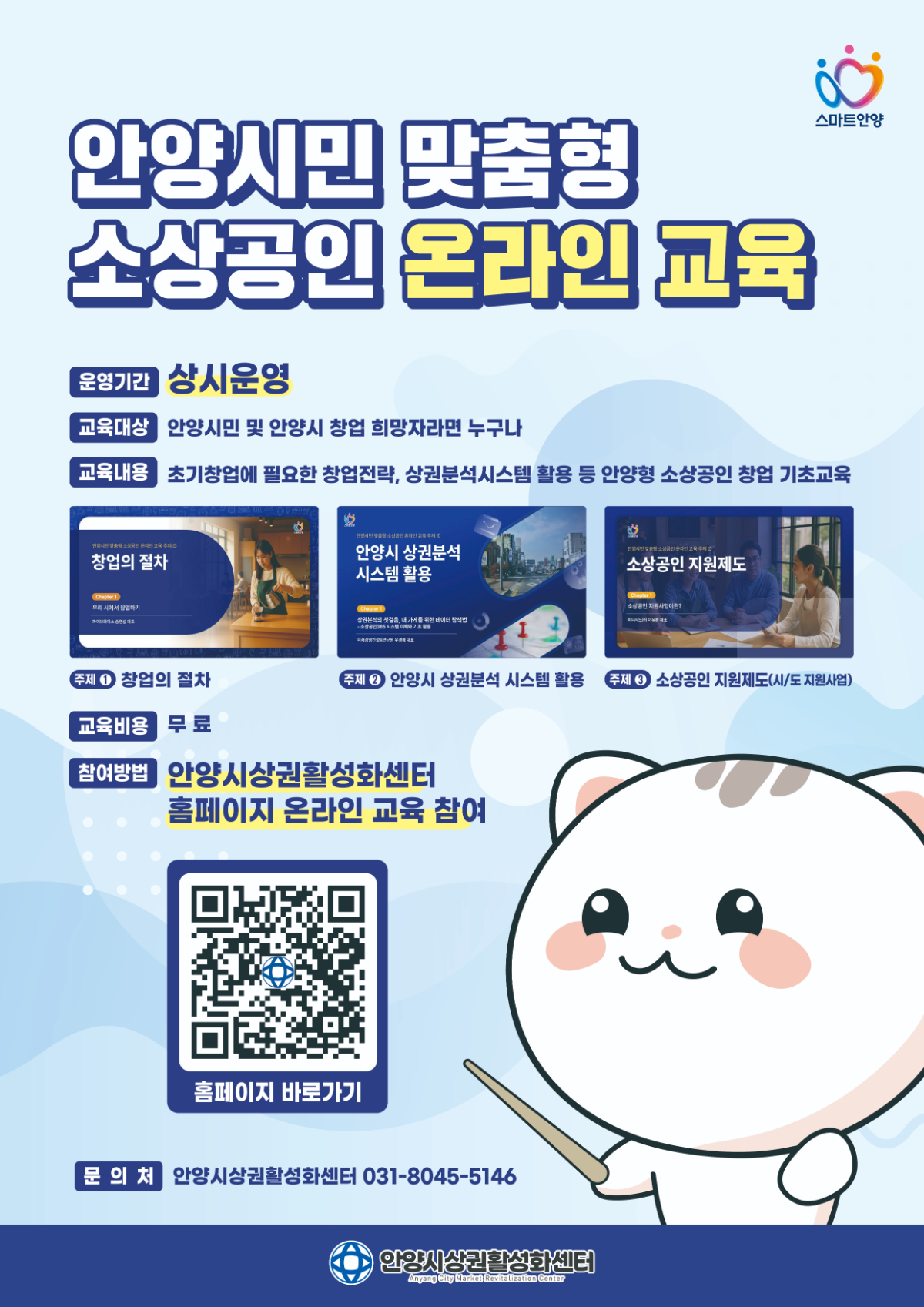 안양시상권활성화센터는 안양시민 및 안양시 창업희망자 누구나 수강하실 수 있는 「안양시민 맞춤형 소상공인 온라인 교육」을 운영합니다. 창업의 절차부터 상권분석시스템 활용법, 소상공인 지원제도 등 초기 창업에 필요한 창업 교육을 무료로 수강해보세요!