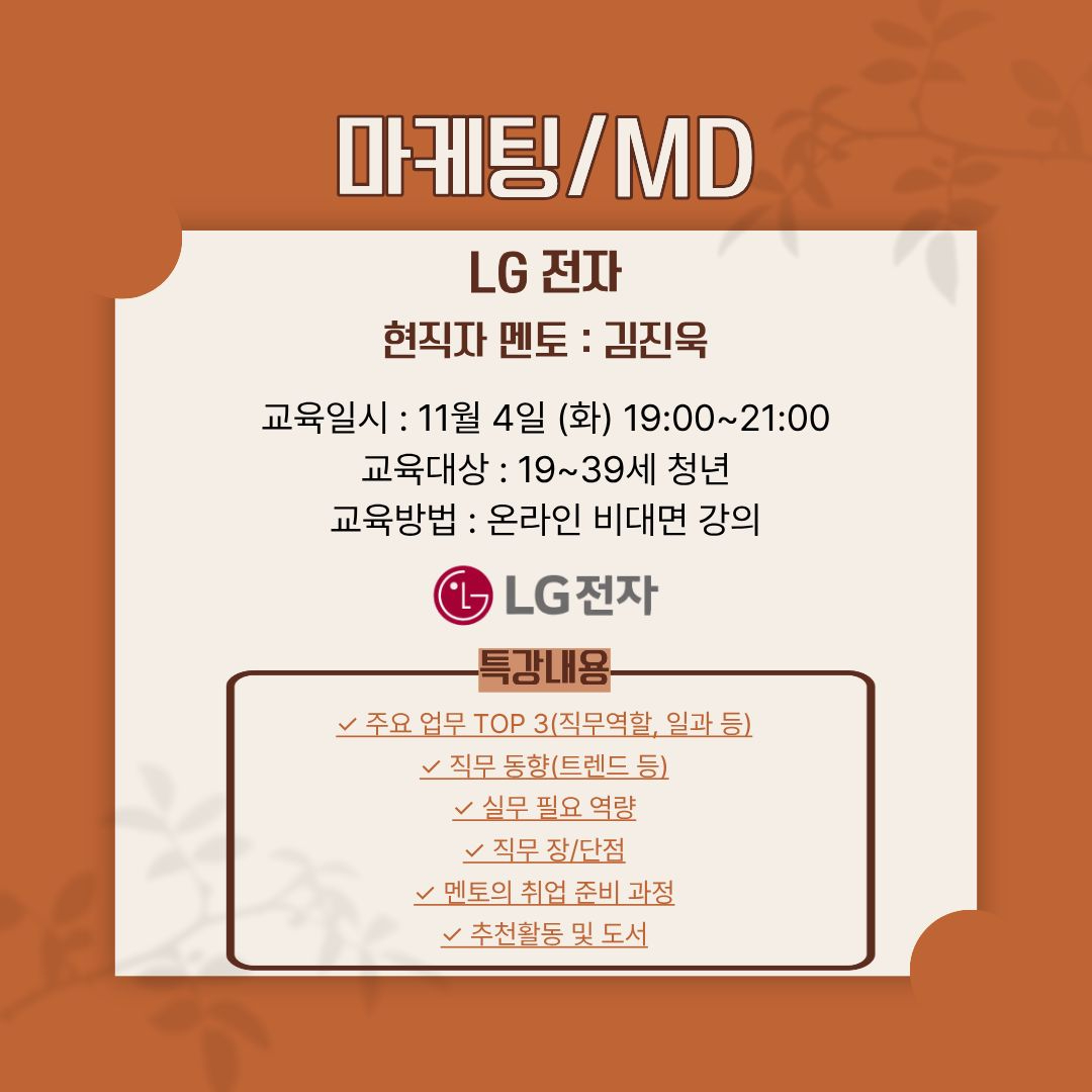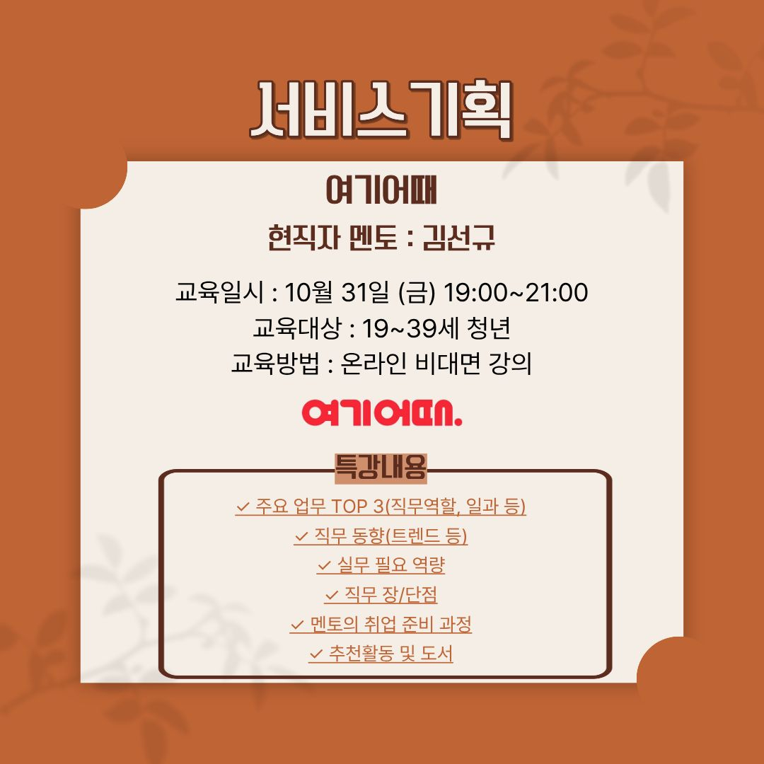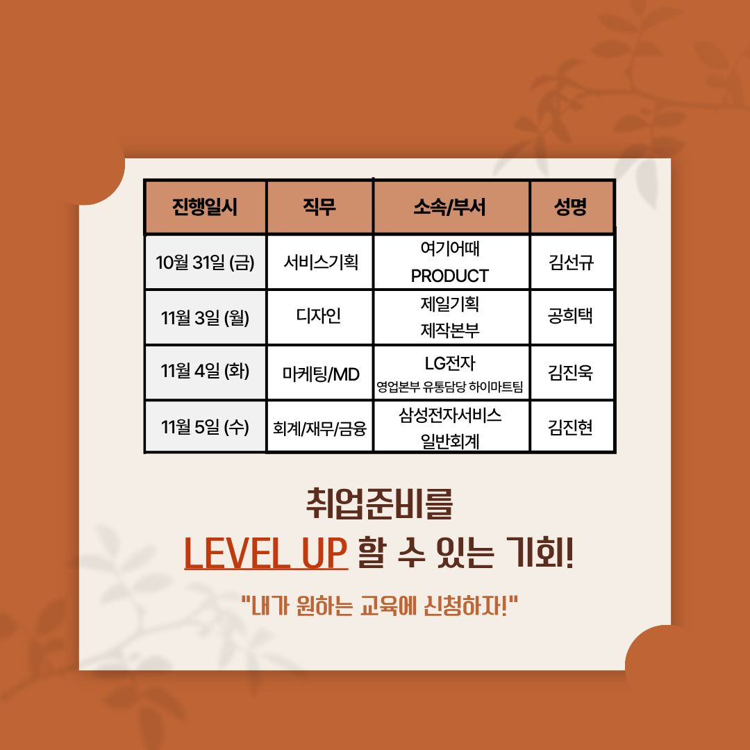 경이로운 직무특강이 돌아왔다! [여기어때, 제일기획, LG전자, 삼성전자서비스] 현직자가 전하는 생생한 직무 이야기와 취업 노하우를 만나보세요.