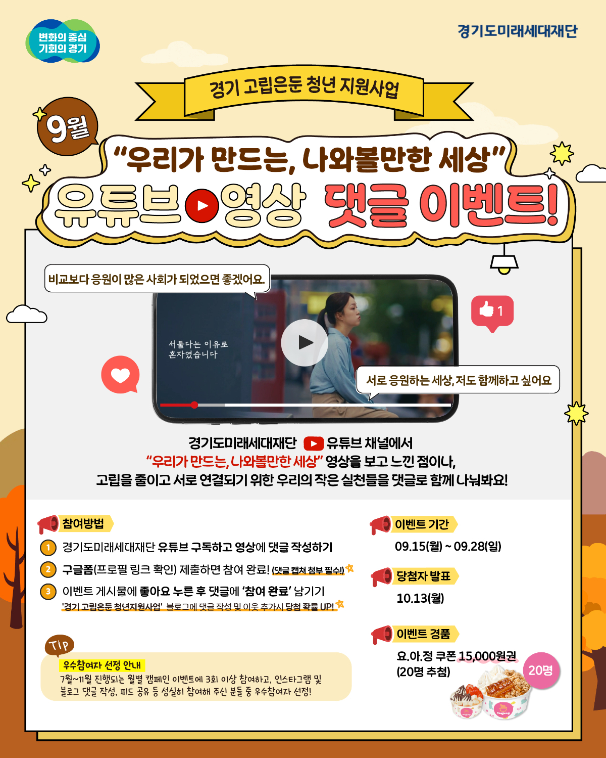 [9월 EVENT] 경기 고립은둔 청년 지원사업 '연결:ON' 캠페인 참여 이벤트! 📝유튜브 영상 댓글 이벤트