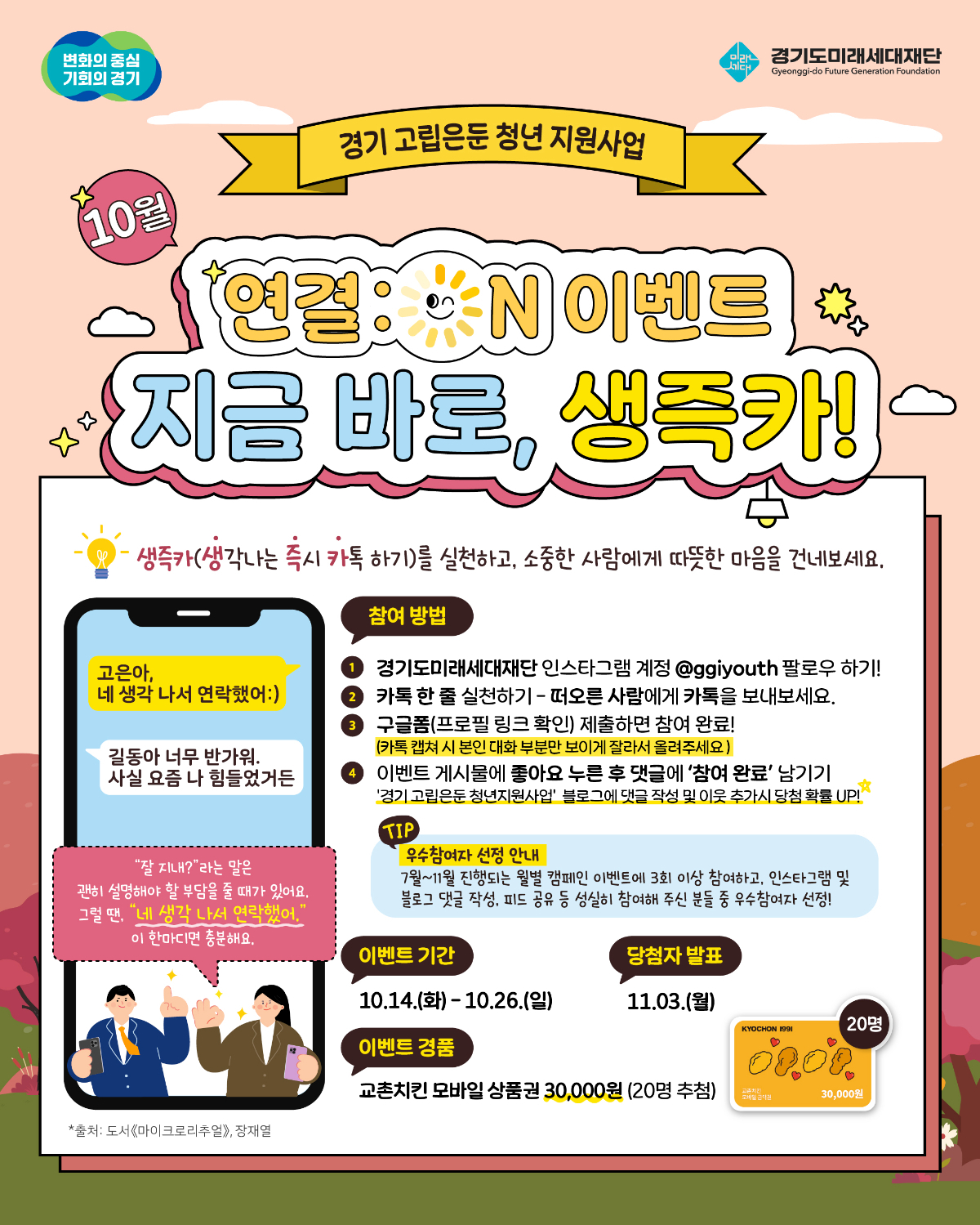[10월 EVENT] 경기 고립은둔 청년 지원사업 '연결:ON' 캠페인 참여 이벤트! 📲생즉카(생각나는 즉시 카톡 하기) 이벤트