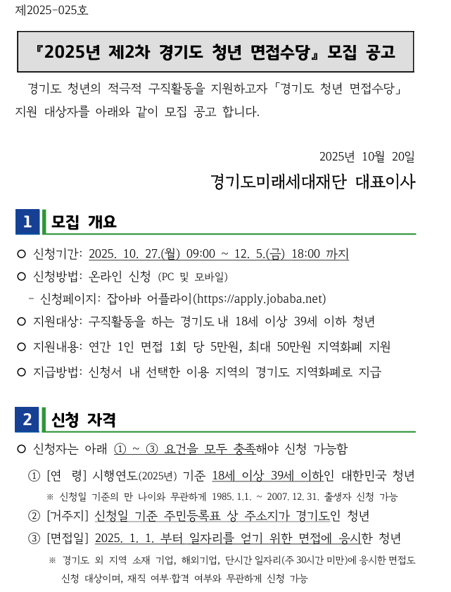 [공지] 『2025년 제2차 경기도 청년 면접수당』 모집 공고