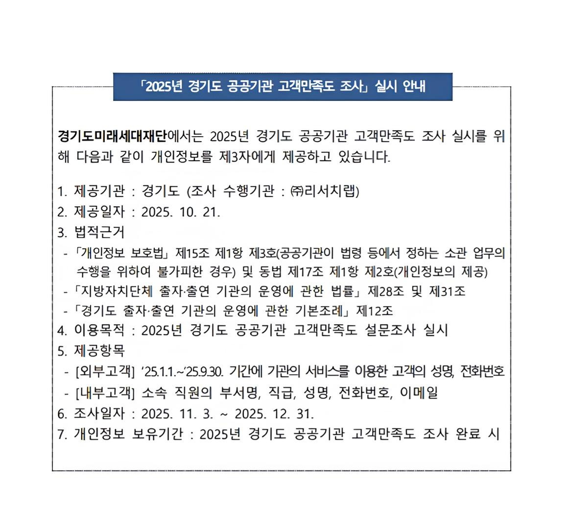 「2025년 경기도 공공기관 고객만족도 조사」실시 안내